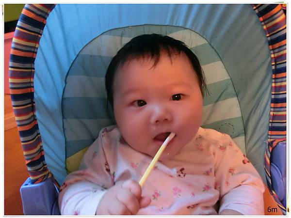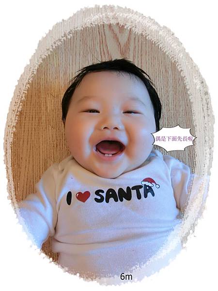 5m28d下面2顆門牙齊發,從此馬麻進入痛苦親餵期,7m20d上面2顆門牙也一起長,只是離得有點開(中間有牙肉),會拿牙刷學葛格東刷刷西刷刷(其實只是在吃啦)。