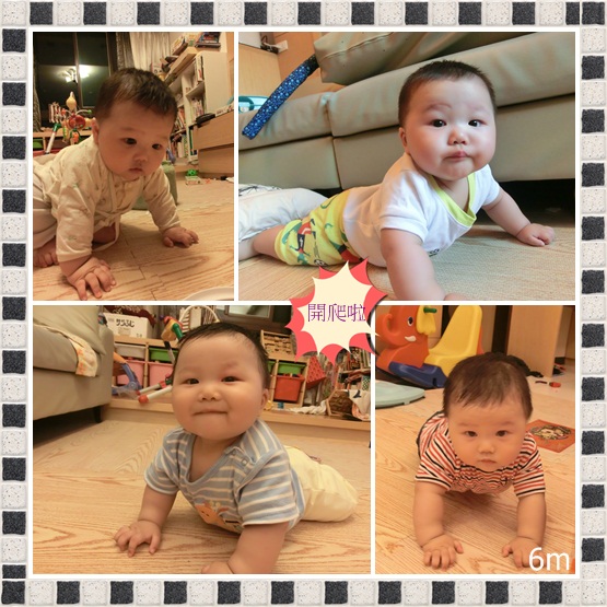 3個月時會稍微側身,6m20d會自己坐,但直到6m24d才真正會翻身,讓馬麻擔心了好一陣子(醫生是說他早就準備好了 只是太胖翻不過來),但之後進展超快速,翻身後2天已經可以倒退嚕,7m10d會匍匐前進,7m21d以阿吉仔姿勢緩慢爬行,8m15d雙腳並用可快速前進,現在(9m10d)瑋瑋要追他要用小跑步才可以。