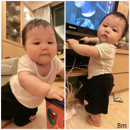 不過這小子最愛的是站,8m2d會自己扶東西站起來,完全不需別人幫忙,8m25d會扶著東西像螃蟹走~~是說,雖然他是自發性的,馬麻還是覺得太早 多爬才會聰明啊!!!
