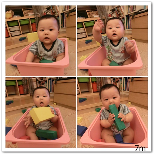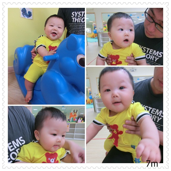 7m16d發出”ㄇㄚㄇㄚ”聲音(耶 先叫馬麻 讚!乖兒子),但隔天隨即叫”ㄅㄚㄅㄚ”,到現在還不會叫葛格,瑋瑋好傷心(是說,會叫就是天才兒童了吧)。8m26d對他說好棒,會自己拍拍手,9m10d會揮手掰掰